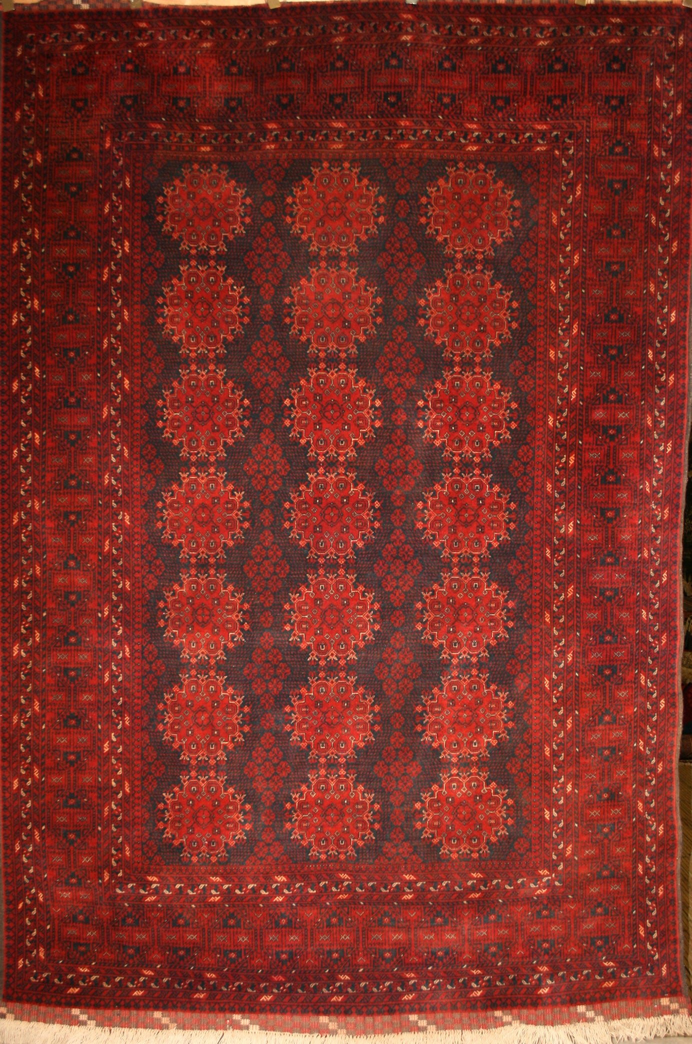 This hand-knotted Afghan Khal Mohammadi rug showcases the bold, geometric beauty of Turkmen tribal design. Its deep indigo background with rich red medallions adds striking contrast and character. Ideal for traditional, rustic, or minimalist interiors, it combines authenticity with practical durability.