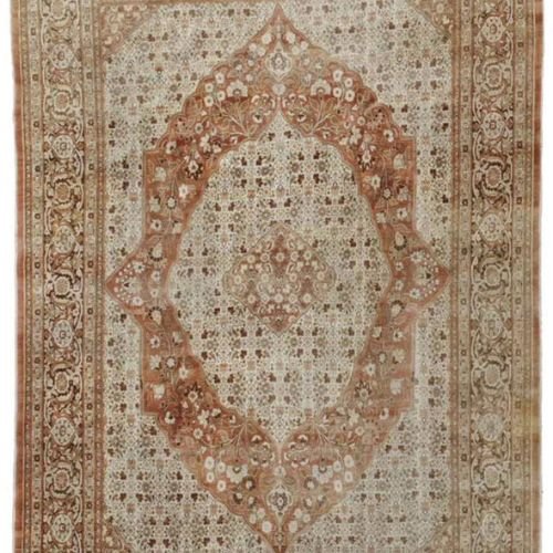 This fine Antique Persian Tabriz Rug, crafted by Hadji Jalili weavers circa 1890, features a grand central medallion with delicate floral detailing. Woven in soft cream and brown-pink tones, it reflects the refined color palette typical of the Hadji Jalili style. Its fine knotting ensures a luxuriously soft feel underfoot. Ideal for elegant bedrooms or living spaces, this rug adds a calming, timeless charm.