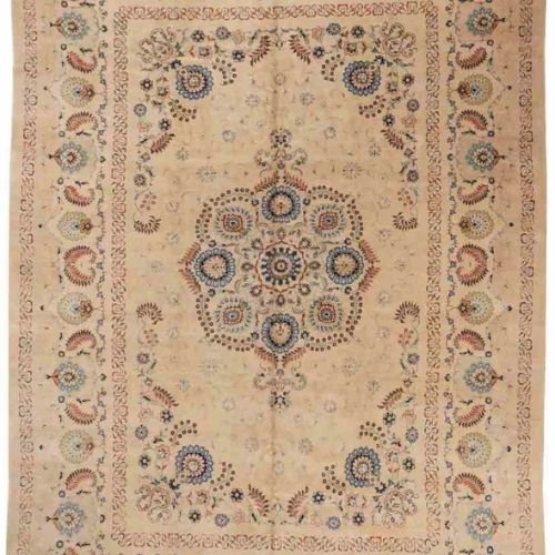 This antique Persian Kashan rug, hand-knotted circa 1930, features a rare cream base with an elegant floral medallion in rich blue and brown tones. Crafted with high-quality wool, it’s both soft and durable underfoot. Its unique design and muted palette offer timeless grandeur. Perfect for classic interiors seeking a refined centerpiece.