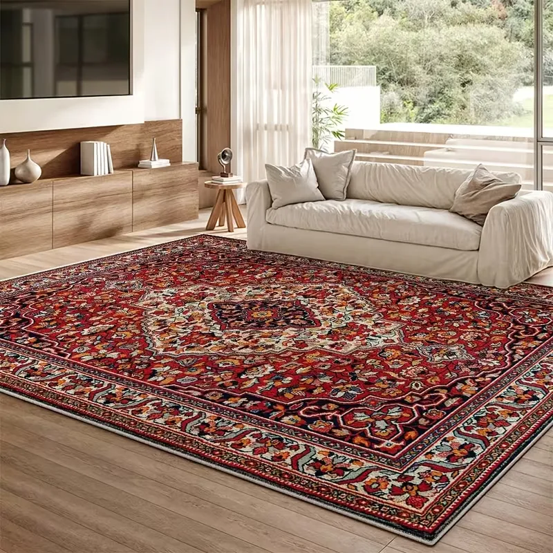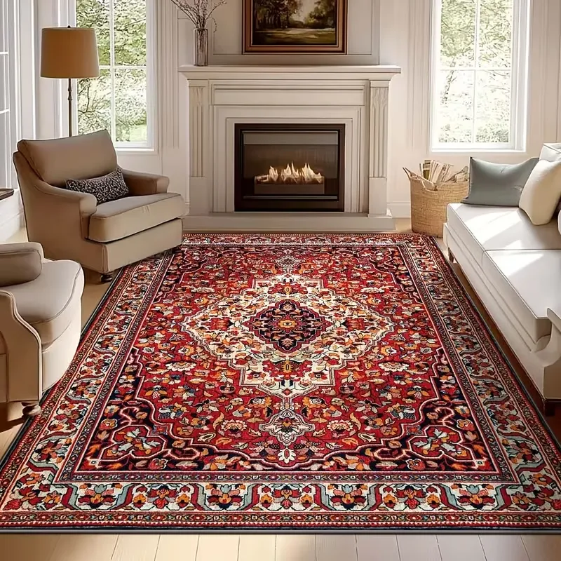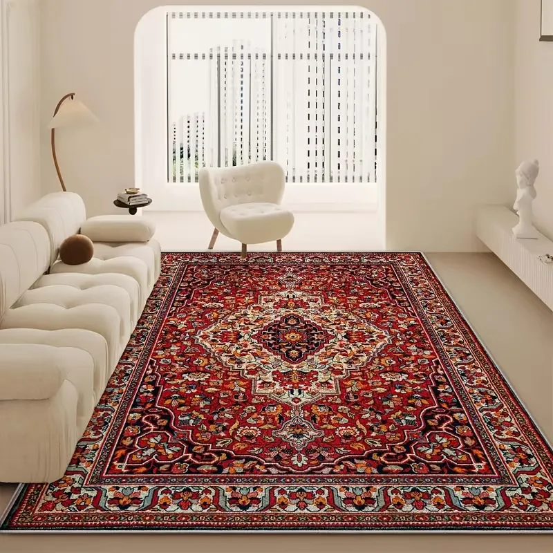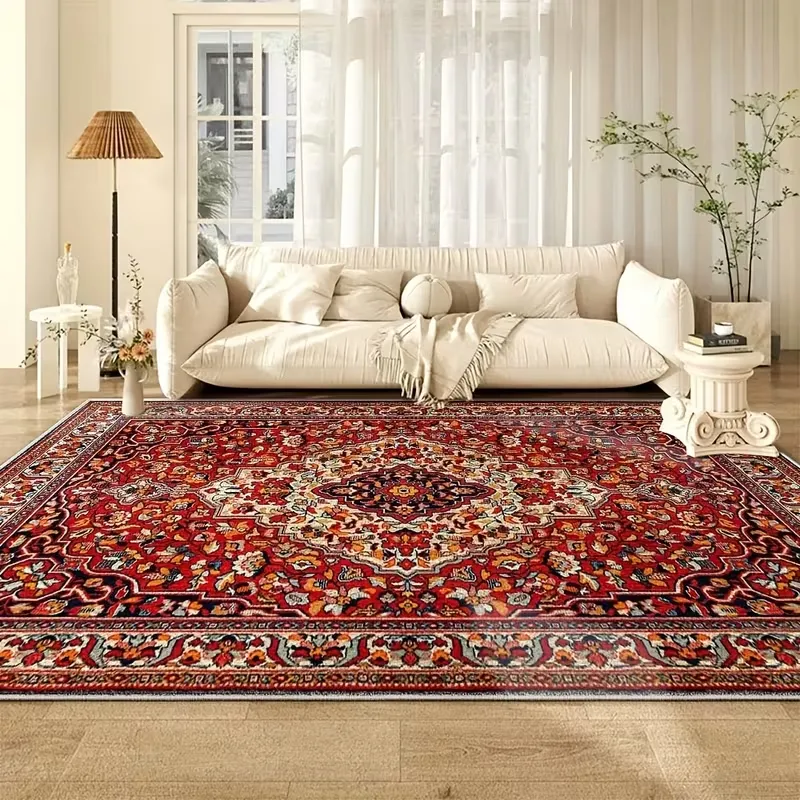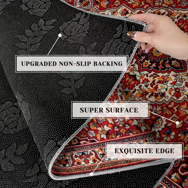 Persian Carpets in velvet style with 850 g/sqm density, soft and fluffy texture, non-slip backing, and colorful retro red pattern. Durable, easy to cut, and low-maintenance, ideal for hallways, courtyards, and living spaces with artistic design.