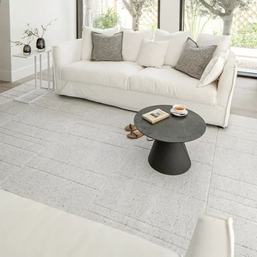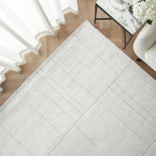 This contemporary rug brings subtle sophistication to your interiors with its alternating wide and narrow rectangular pattern. Crafted in gentle tones of grey and white, its structured design stands out through varying pile heights, giving the surface a soft texture and dimensional look.