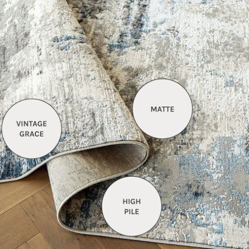 Add depth and a vintage-inspired charm to your interiors with this beautifully textured rug. Featuring a softly faded pattern in muted greys, accented by hints of blue and brown, it creates a calm and weathered look. The dense high pile in art silk offers a matte finish with a luxurious, cushioned feel underfoot.